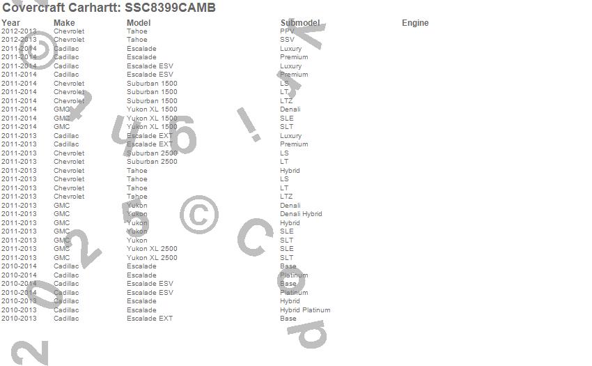 Below is an abbreviated list of applications for the Covercraft Carhartt SeatSaver.Escalade, Escalade ESV, Escalade EXT, Suburban 1500, Suburban 2500, Tahoe, Yukon, Yukon XL 1500, Yukon XL 2500, Cadillac, Chevrolet, GMC, 2014, 2013, 2012, 2011, 2010