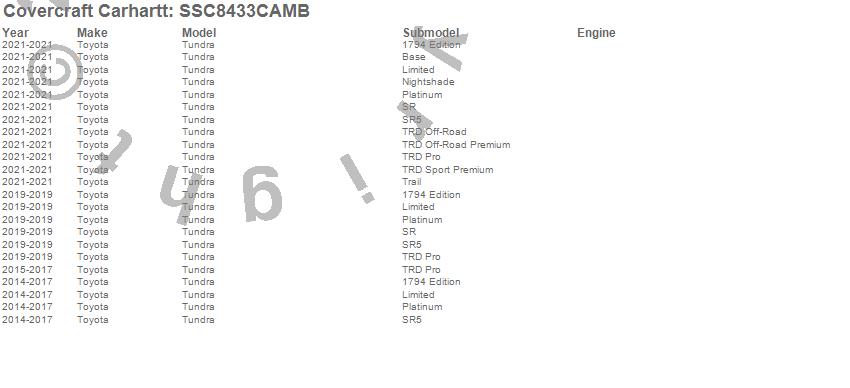 Below is an abbreviated list of applications for the Covercraft Carhartt SeatSaver.Tundra, Toyota, 2021, 2020, 2019, 2017, 2016, 2015, 2014