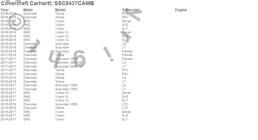 Below is an abbreviated list of applications for the Covercraft Carhartt SeatSaver.Suburban, Suburban 1500, Suburban 3500 HD, Tahoe, Yukon, Yukon XL, Chevrolet, GMC, 2020, 2019, 2018, 2017, 2016, 2015, 2014