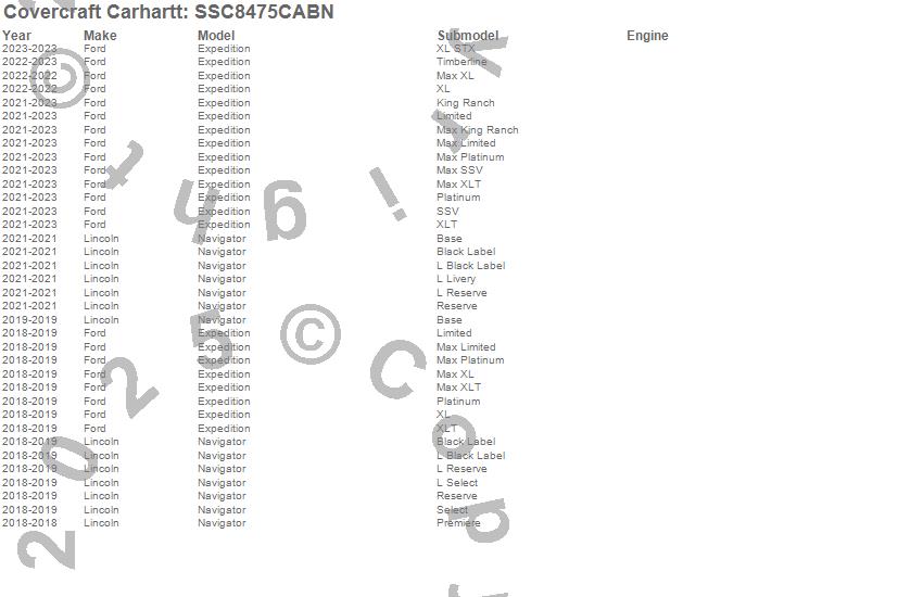 Below is an abbreviated list of applications for the Covercraft Carhartt SeatSaver.Expedition, Navigator, Ford, Lincoln, 2025, 2024, 2023, 2022, 2021, 2020, 2019, 2018