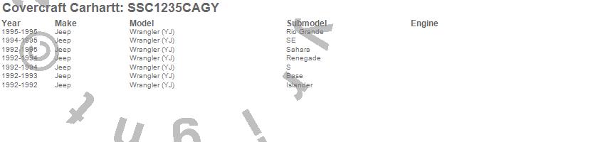 Below is an abbreviated list of applications for the Covercraft Carhartt SeatSaver.Wrangler (YJ), Jeep, 1995, 1994, 1993, 1992