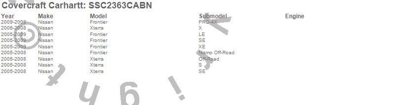 Below is an abbreviated list of applications for the Covercraft Carhartt SeatSaver.Frontier, Xterra, Nissan, 2009, 2008, 2007, 2006, 2005