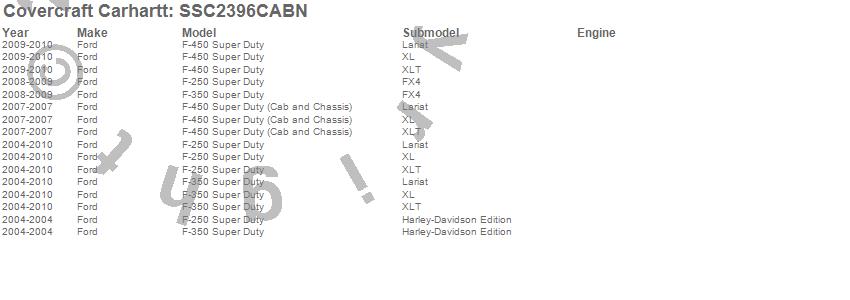 Below is an abbreviated list of applications for the Covercraft Carhartt SeatSaver.F-250 Super Duty, F-350 Super Duty, F-450 Super Duty, Ford, 2010, 2009, 2008, 2007, 2006, 2005, 2004