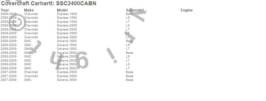 Below is an abbreviated list of applications for the Covercraft Carhartt SeatSaver.Express 1500, Express 2500, Express 3500, Savana 1500, Savana 2500, Savana 3500, Chevrolet, GMC, 2009, 2008, 2007