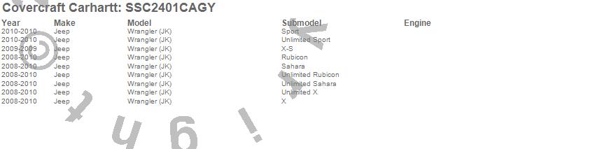 Below is an abbreviated list of applications for the Covercraft Carhartt SeatSaver.Wrangler (JK), Jeep, 2010, 2009, 2008