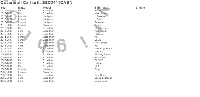 Below is an abbreviated list of applications for the Covercraft Carhartt SeatSaver.Expedition, Navigator, Ford, Lincoln, 2017, 2016, 2015, 2014, 2013, 2012, 2011, 2010, 2009