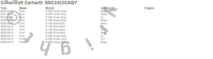 Below is an abbreviated list of applications for the Covercraft Carhartt SeatSaver.E-150 Econoline, E-250 Econoline, E-350 Super Duty, E-450 Super Duty, F-450 Super Duty, Ford, 2025, 2024, 2023, 2022, 2021, 2019, 2018, 2017, 2016, 2015, 2014, 2013, 2012, 2011