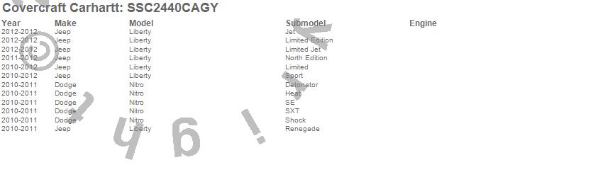 Below is an abbreviated list of applications for the Covercraft Carhartt SeatSaver.Liberty, Nitro, Dodge, Jeep, 2012, 2011, 2010