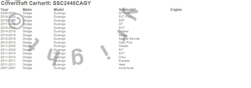 Below is an abbreviated list of applications for the Covercraft Carhartt SeatSaver.Durango, Dodge, 2020, 2019, 2018, 2017, 2016, 2015, 2014, 2013, 2012, 2011, 2007