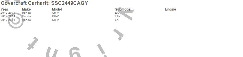 Below is an abbreviated list of applications for the Covercraft Carhartt SeatSaver.CR-V, Honda, 2014, 2013, 2012