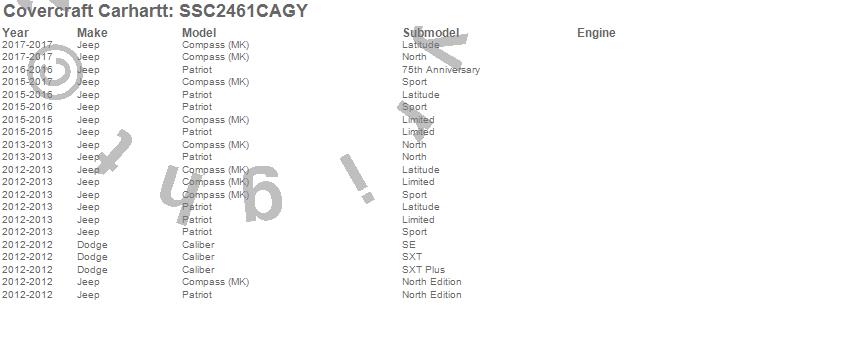 Below is an abbreviated list of applications for the Covercraft Carhartt SeatSaver.Caliber, Compass, Patriot, Dodge, Jeep, 2017, 2016, 2015, 2013, 2012