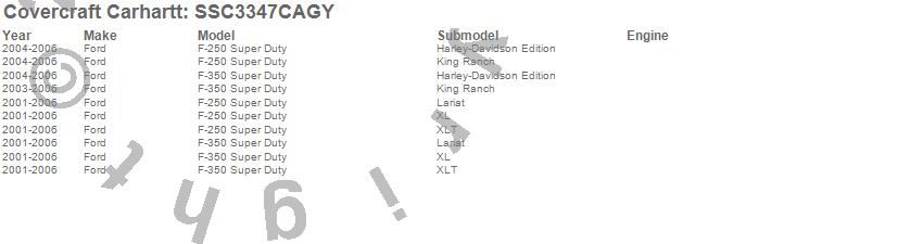 Below is an abbreviated list of applications for the Covercraft Carhartt SeatSaver.F-250 Super Duty, F-350 Super Duty, Ford, 2006, 2005, 2004, 2003, 2002, 2001