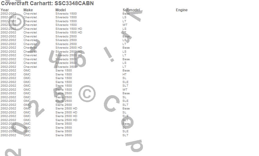 Below is an abbreviated list of applications for the Covercraft Carhartt SeatSaver.Sierra 1500, Sierra 2500, Sierra 2500 HD, Sierra 3500, Silverado 1500, Silverado 1500 HD, Silverado 2500, Silverado 2500 HD, Silverado 3500, Chevrolet, GMC, 2002