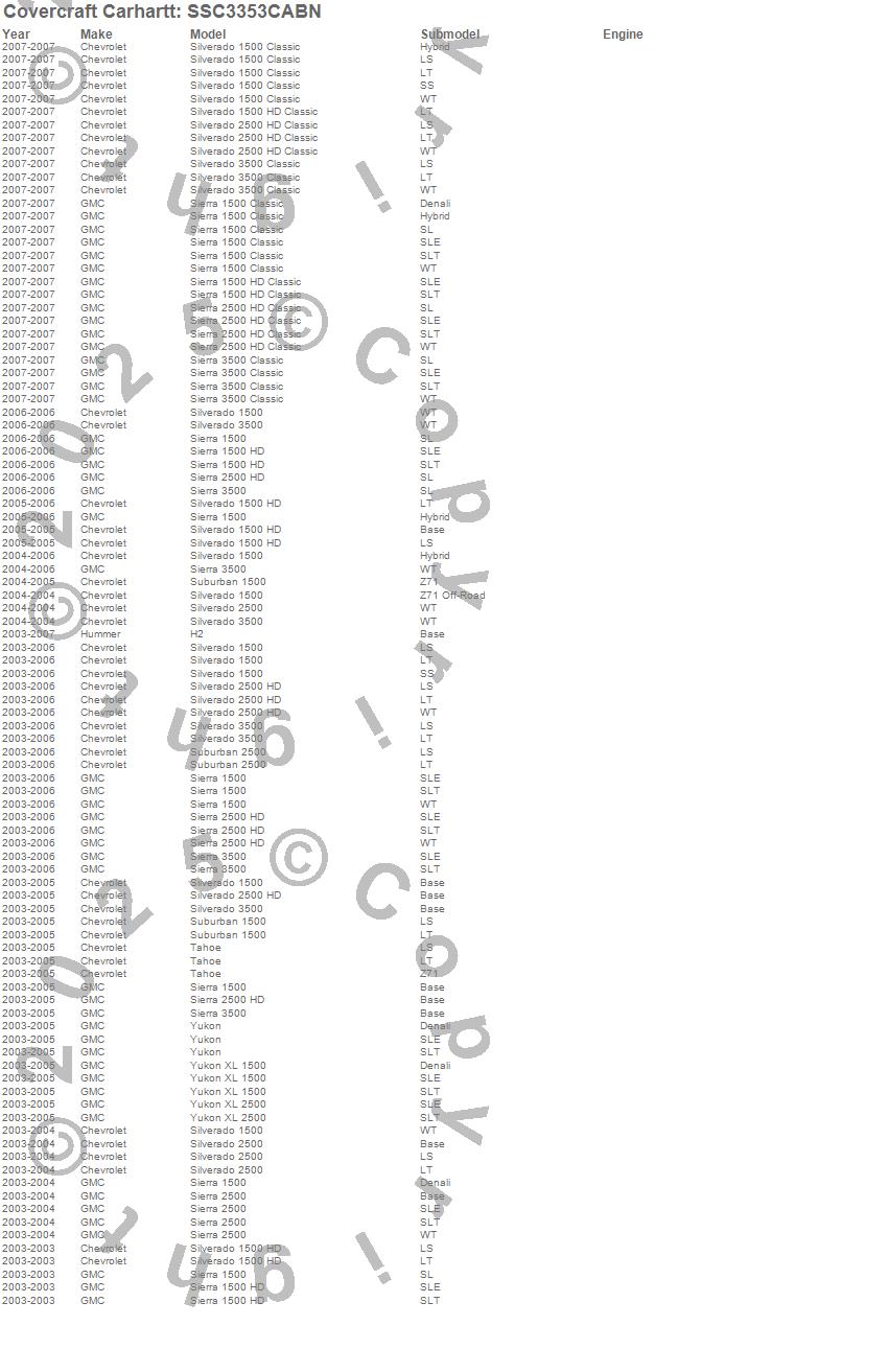 Below is an abbreviated list of applications for the Covercraft Carhartt SeatSaver.H2, Sierra 1500, Sierra 1500 Classic, Sierra 1500 HD, Sierra 1500 HD Classic, Sierra 2500, Sierra 2500 HD, Sierra 2500 HD Classic, Sierra 3500, Sierra 3500 Classic, Silverado 1500, Silverado 1500 Classic, Silverado 1500 HD, Silverado 1500 HD Classic, Silverado 2500, Silverado 2500 HD, Silverado 2500 HD Classic, Silverado 3500, Silverado 3500 Classic, Suburban 1500