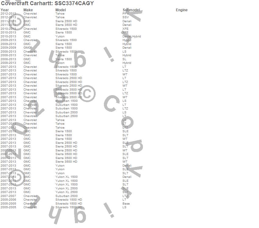 Below is an abbreviated list of applications for the Covercraft Carhartt SeatSaver.Sierra 1500, Sierra 2500 HD, Sierra 3500 HD, Silverado 1500, Silverado 1500 HD, Silverado 2500 HD, Silverado 3500 HD, Suburban 1500, Suburban 2500, Tahoe, Yukon, Yukon XL 1500, Yukon XL 2500, Chevrolet, GMC, 2013, 2012, 2011, 2010, 2009