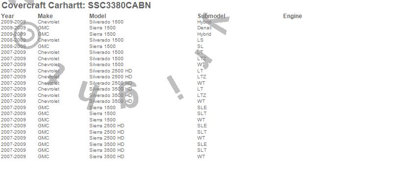 Below is an abbreviated list of applications for the Covercraft Carhartt SeatSaver.Sierra 1500, Sierra 2500 HD, Sierra 3500 HD, Silverado 1500, Silverado 2500 HD, Silverado 3500 HD, Chevrolet, GMC, 2009, 2008, 2007