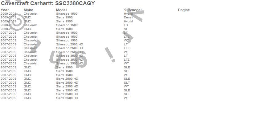 Below is an abbreviated list of applications for the Covercraft Carhartt SeatSaver.Sierra 1500, Sierra 2500 HD, Sierra 3500 HD, Silverado 1500, Silverado 2500 HD, Silverado 3500 HD, Chevrolet, GMC, 2009, 2008, 2007