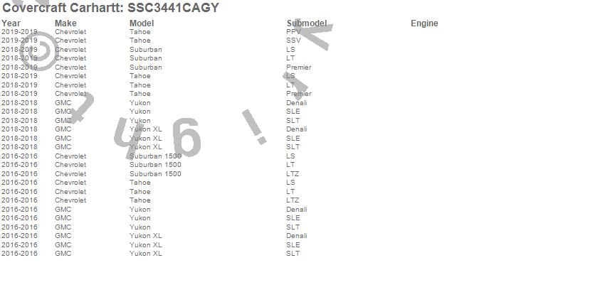 Below is an abbreviated list of applications for the Covercraft Carhartt SeatSaver.Suburban, Suburban 1500, Tahoe, Yukon, Yukon XL, Chevrolet, GMC, 2020, 2019, 2018, 2016