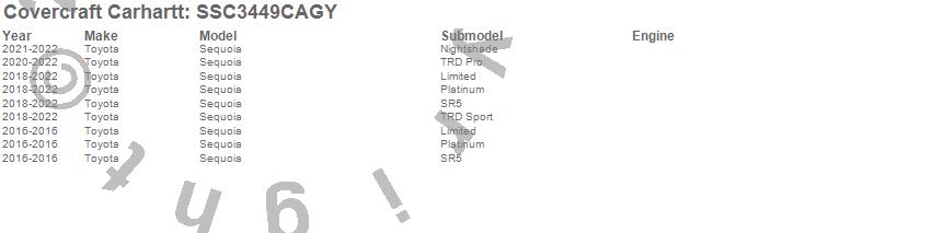 Below is an abbreviated list of applications for the Covercraft Carhartt SeatSaver.Sequoia, Toyota, 2022, 2021, 2020, 2019, 2018, 2016
