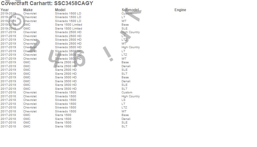 Below is an abbreviated list of applications for the Covercraft Carhartt SeatSaver.Sierra 1500, Sierra 1500 Limited, Sierra 2500 HD, Sierra 3500 HD, Silverado 1500, Silverado 1500 LD, Silverado 2500 HD, Silverado 3500 HD, Chevrolet, GMC, 2019, 2018, 2017