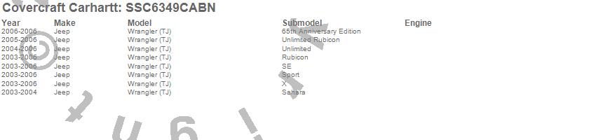 Below is an abbreviated list of applications for the Covercraft Carhartt SeatSaver.Wrangler (TJ), Jeep, 2006, 2005, 2004, 2003