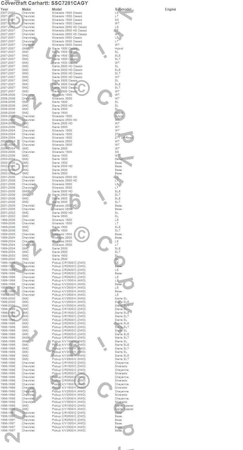 Below is an abbreviated list of applications for the Covercraft Carhartt SeatSaver.C1500 Pickup, C2500 Pickup, C3500 Pickup, K1500 Pickup, K2500 Pickup, K3500 Pickup, Sierra 1500, Sierra 1500 Classic, Sierra 2500, Sierra 2500 HD, Sierra 2500 HD Classic, Sierra 3500, Sierra 3500 Classic, Silverado 1500, Silverado 1500 Classic, Silverado 2500, Silverado 2500 HD, Silverado 2500 HD Classic, Silverado 3500, Silverado 3500 Classic