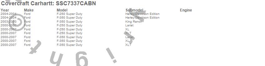Below is an abbreviated list of applications for the Covercraft Carhartt SeatSaver.F-250 Super Duty, F-350 Super Duty, Ford, 2007, 2006, 2005, 2004, 2003, 2002, 2001, 2000