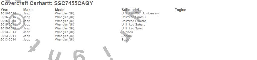 Below is an abbreviated list of applications for the Covercraft Carhartt SeatSaver.Wrangler (JK), Jeep, 2018, 2017, 2016, 2015, 2014, 2013