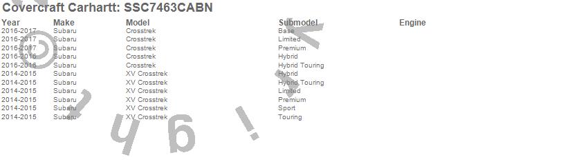 Below is an abbreviated list of applications for the Covercraft Carhartt SeatSaver.Crosstrek, XV Crosstrek, Subaru, 2017, 2016, 2015, 2014