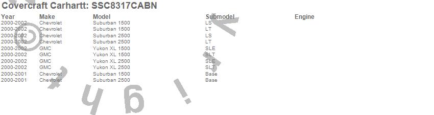 Below is an abbreviated list of applications for the Covercraft Carhartt SeatSaver.Suburban 1500, Suburban 2500, Yukon XL 1500, Yukon XL 2500, Chevrolet, GMC, 2002, 2001, 2000