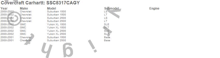 Below is an abbreviated list of applications for the Covercraft Carhartt SeatSaver.Suburban 1500, Suburban 2500, Yukon XL 1500, Yukon XL 2500, Chevrolet, GMC, 2002, 2001, 2000