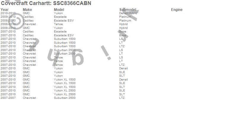 Below is an abbreviated list of applications for the Covercraft Carhartt SeatSaver.Escalade, Escalade ESV, Suburban 1500, Suburban 2500, Tahoe, Yukon, Yukon XL 1500, Yukon XL 2500, Cadillac, Chevrolet, GMC, 2010, 2009, 2008, 2007