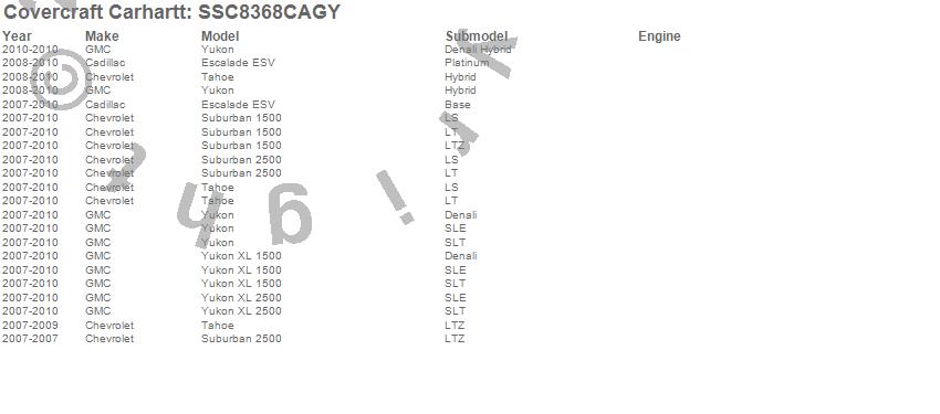 Below is an abbreviated list of applications for the Covercraft Carhartt SeatSaver.Escalade ESV, Suburban 1500, Suburban 2500, Tahoe, Yukon, Yukon XL 1500, Yukon XL 2500, Cadillac, Chevrolet, GMC, 2010, 2009, 2008, 2007