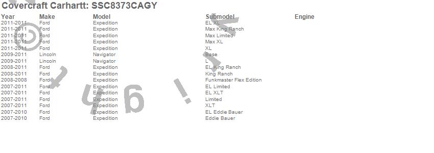Below is an abbreviated list of applications for the Covercraft Carhartt SeatSaver.Expedition, Navigator, Ford, Lincoln, 2011, 2010, 2009, 2008, 2007