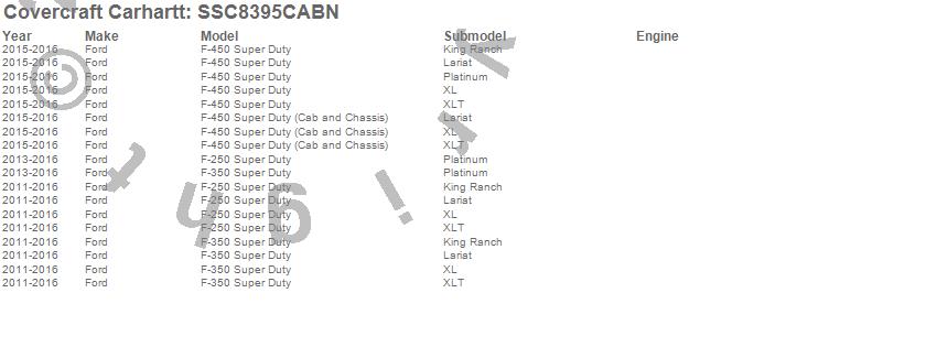 Below is an abbreviated list of applications for the Covercraft Carhartt SeatSaver.F-250 Super Duty, F-350 Super Duty, F-450 Super Duty, Ford, 2016, 2015, 2014, 2013, 2012, 2011