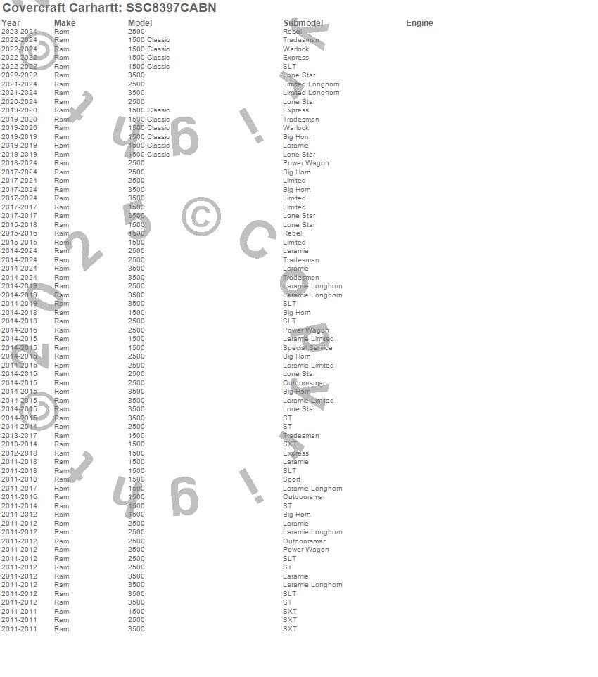 Below is an abbreviated list of applications for the Covercraft Carhartt SeatSaver.1500, 1500 Classic, 2500, 3500, Ram, 2025, 2024, 2023, 2022, 2021, 2020, 2019, 2018, 2017, 2016, 2015, 2014, 2013, 2012, 2011
