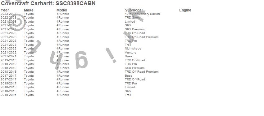 Below is an abbreviated list of applications for the Covercraft Carhartt SeatSaver.4Runner, Toyota, 2024, 2023, 2022, 2021, 2020, 2019, 2018, 2017, 2016, 2015, 2014, 2013, 2012, 2011, 2010
