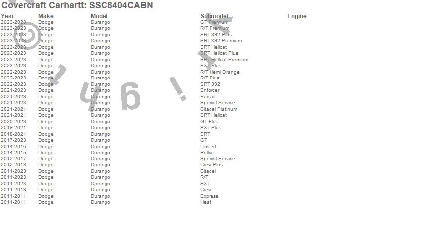 Below is an abbreviated list of applications for the Covercraft Carhartt SeatSaver.Durango, Dodge, 2023, 2022, 2021, 2020, 2019, 2018, 2017, 2016, 2015, 2014, 2013, 2012, 2011