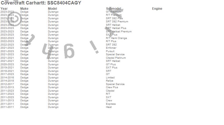 Below is an abbreviated list of applications for the Covercraft Carhartt SeatSaver.Durango, Dodge, 2023, 2022, 2021, 2020, 2019, 2018, 2017, 2016, 2015, 2014, 2013, 2012, 2011