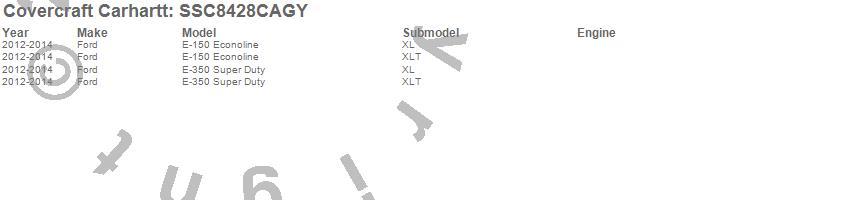 Below is an abbreviated list of applications for the Covercraft Carhartt SeatSaver.E-150 Econoline, E-350 Super Duty, Ford, 2014, 2013, 2012
