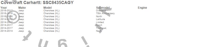 Below is an abbreviated list of applications for the Covercraft Carhartt SeatSaver.Cherokee (KL), Jeep, 2017, 2016, 2015, 2014
