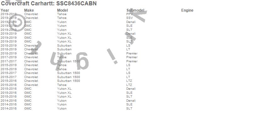 Below is an abbreviated list of applications for the Covercraft Carhartt SeatSaver.Suburban, Suburban 1500, Tahoe, Yukon, Yukon XL, Chevrolet, GMC, 2020, 2019, 2018, 2017, 2016, 2015, 2014