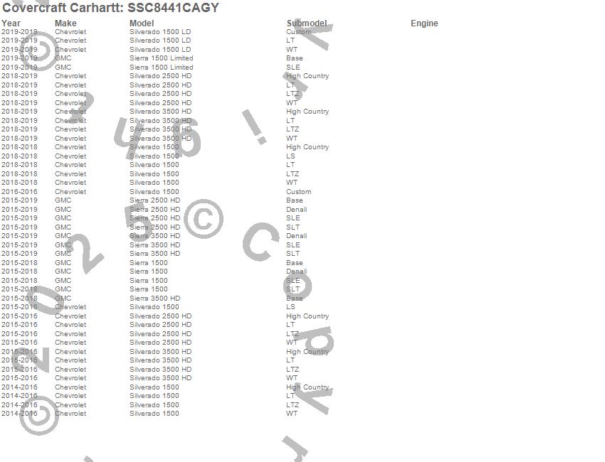 Below is an abbreviated list of applications for the Covercraft Carhartt SeatSaver.Sierra 1500, Sierra 1500 Limited, Sierra 2500 HD, Sierra 3500 HD, Silverado 1500, Silverado 1500 LD, Silverado 2500 HD, Silverado 3500 HD, Chevrolet, GMC, 2019, 2018, 2017, 2016, 2015, 2014