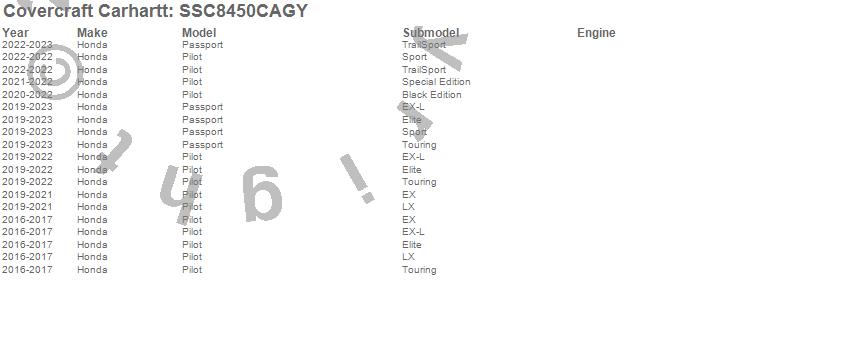 Below is an abbreviated list of applications for the Covercraft Carhartt SeatSaver.Passport, Pilot, Honda, 2025, 2024, 2023, 2022, 2021, 2020, 2019, 2017, 2016