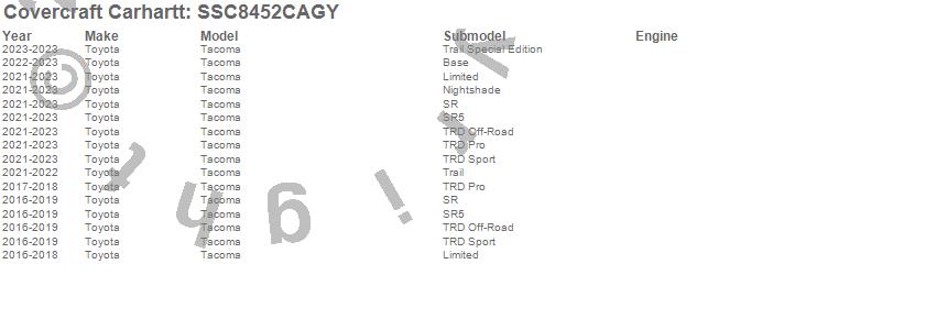 Below is an abbreviated list of applications for the Covercraft Carhartt SeatSaver.Tacoma, Toyota, 2023, 2022, 2021, 2019, 2018, 2017, 2016