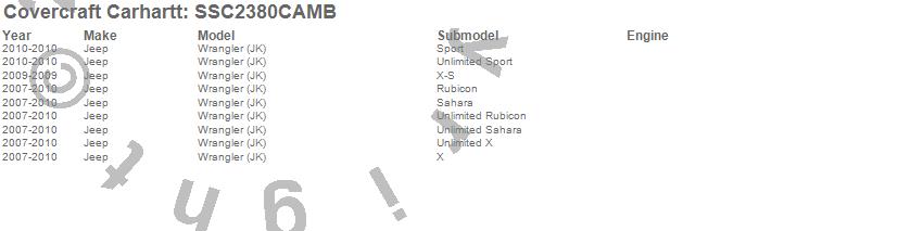 Below is an abbreviated list of applications for the Covercraft Carhartt SeatSaver.Wrangler (JK), Jeep, 2010, 2009, 2008, 2007