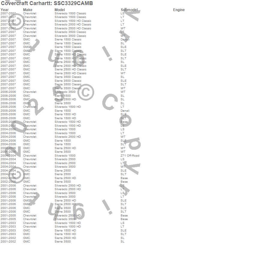 Below is an abbreviated list of applications for the Covercraft Carhartt SeatSaver.Sierra 1500, Sierra 1500 Classic, Sierra 1500 HD, Sierra 1500 HD Classic, Sierra 2500, Sierra 2500 HD, Sierra 2500 HD Classic, Sierra 3500, Sierra 3500 Classic, Silverado 1500, Silverado 1500 Classic, Silverado 1500 HD, Silverado 1500 HD Classic, Silverado 2500, Silverado 2500 HD, Silverado 2500 HD Classic, Silverado 3500, Silverado 3500 Classic, Chevrolet, GMC
