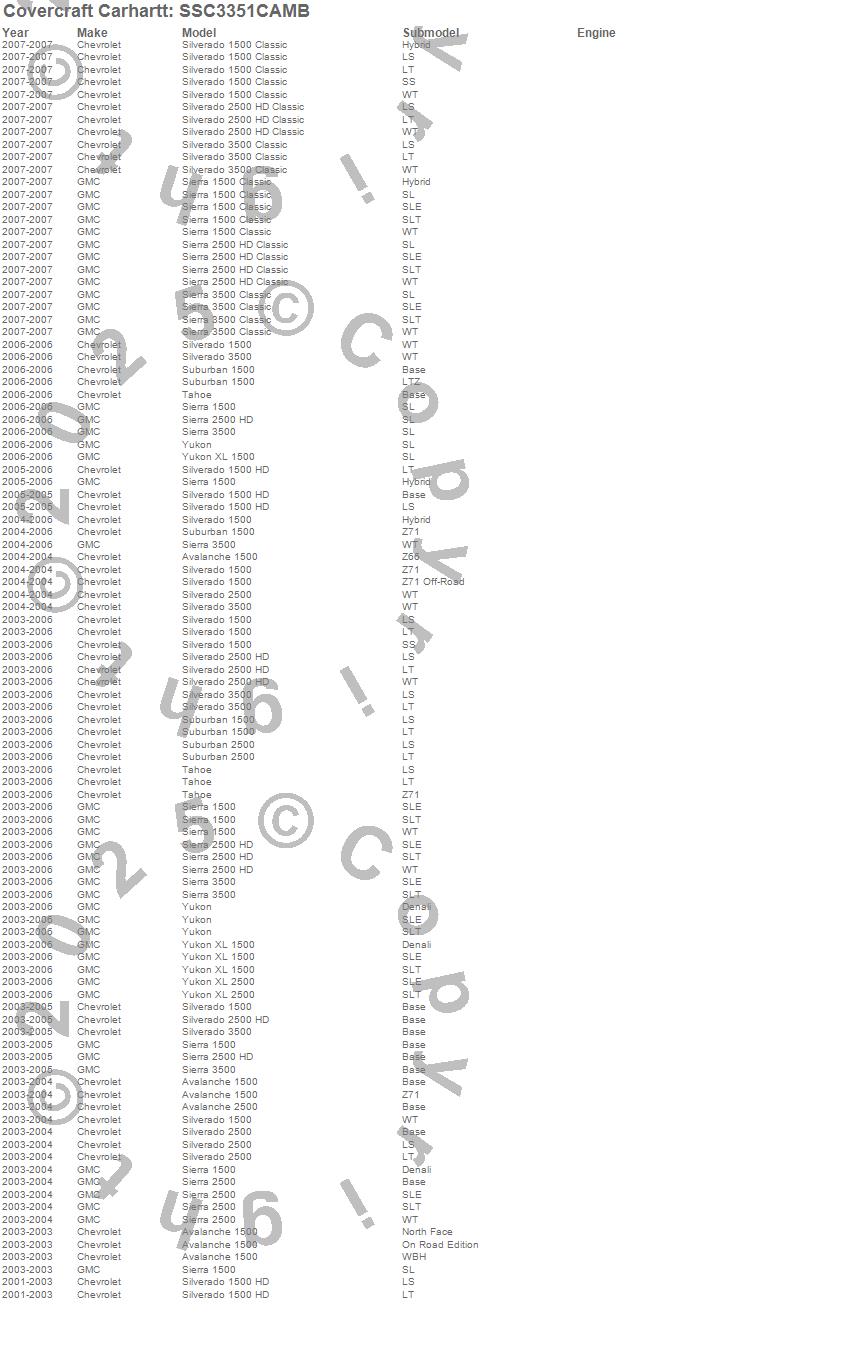 Below is an abbreviated list of applications for the Covercraft Carhartt SeatSaver.Avalanche 1500, Avalanche 2500, Sierra 1500, Sierra 1500 Classic, Sierra 2500, Sierra 2500 HD, Sierra 2500 HD Classic, Sierra 3500, Sierra 3500 Classic, Silverado 1500, Silverado 1500 Classic, Silverado 1500 HD, Silverado 2500, Silverado 2500 HD, Silverado 2500 HD Classic, Silverado 3500, Silverado 3500 Classic, Suburban 1500, Suburban 2500, Tahoe