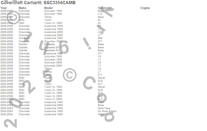 Below is an abbreviated list of applications for the Covercraft Carhartt SeatSaver.Avalanche 1500, Avalanche 2500, Escalade, Escalade ESV, Escalade EXT, Suburban 1500, Suburban 2500, Tahoe, Yukon, Yukon XL 1500, Yukon XL 2500, Cadillac, Chevrolet, GMC, 2006, 2005, 2004, 2003