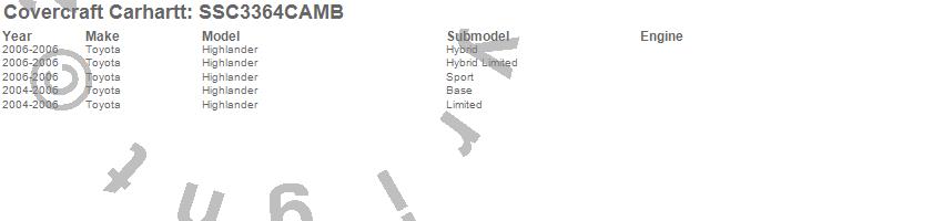 Below is an abbreviated list of applications for the Covercraft Carhartt SeatSaver.Highlander, Toyota, 2006, 2005, 2004